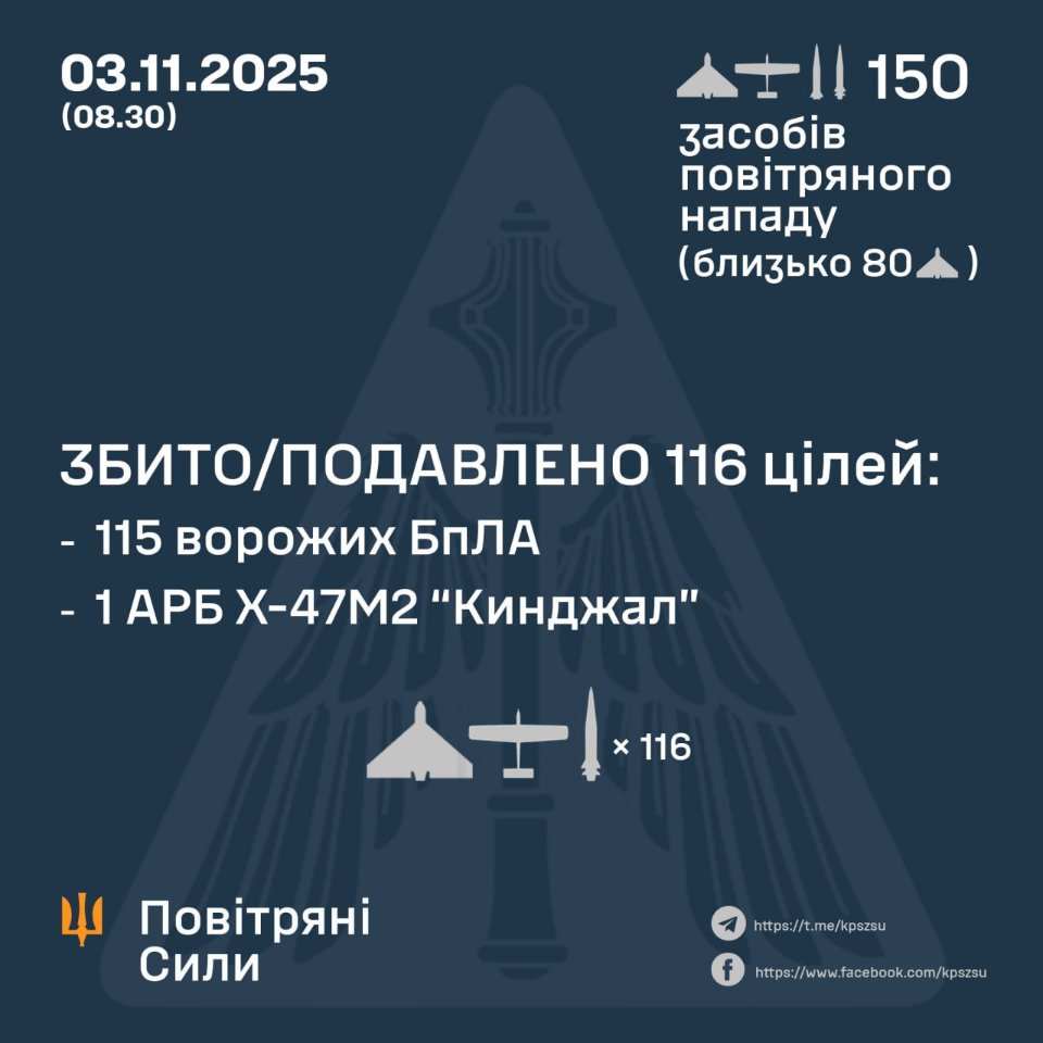 За попередніми даними, станом на 8:30 ранку протиповітряна оборона збила або придушила одну аеробалістичну ракету Х-47М2 «Кинджал» та 115 російських БпЛА на півночі, півдні та сході країни.