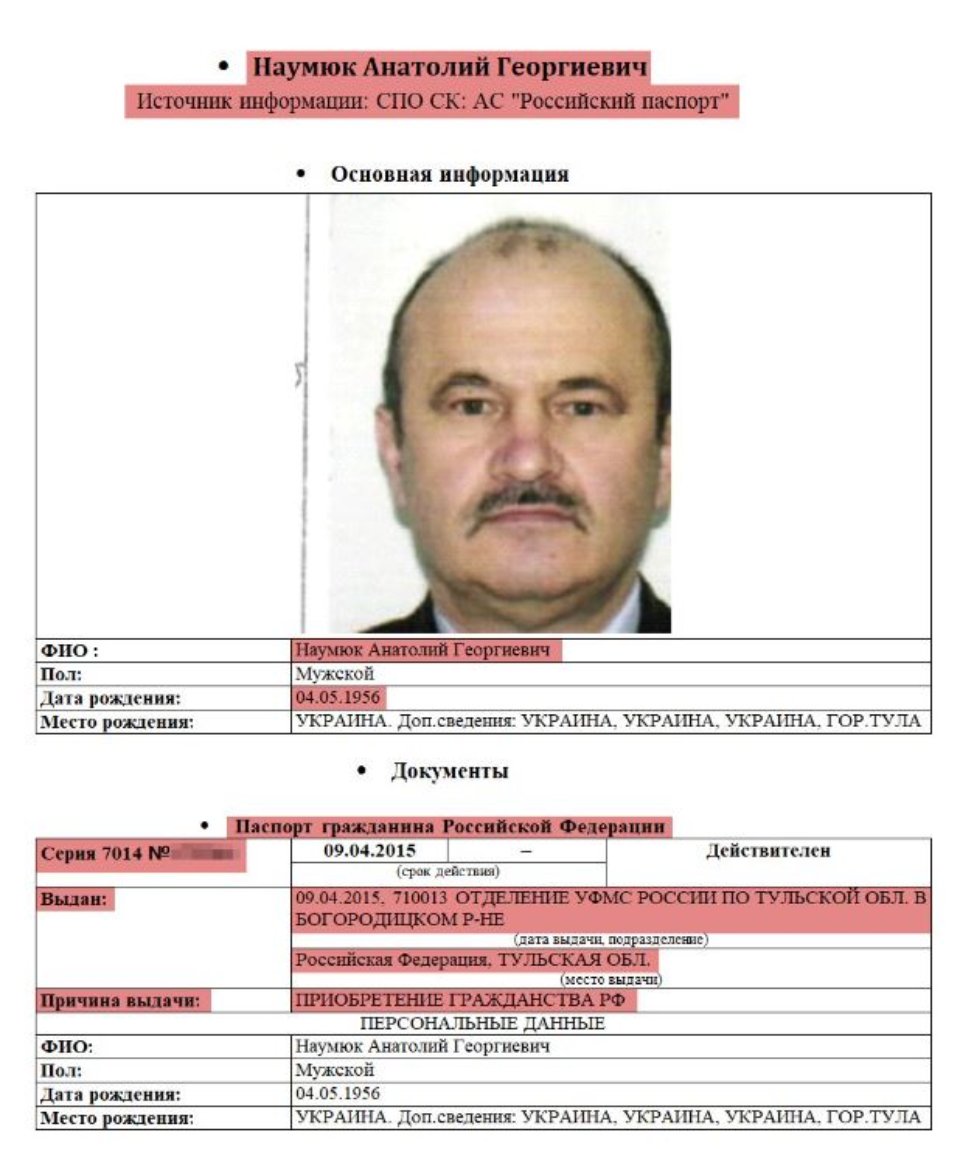 «Відповідно до витягу з реєстру «Роспаспорт», який «Схеми» отримали у своє розпорядження, паспорт громадянина РФ Анатолія Наумюка був оформлений у 2015 році у місті Тула. Відповідно до документа, він подав заяву на отримання громадянства, вказавши підставою видачі паспорта — «набуття громадянства Російської Федерації», — йдеться у розслідуванні.