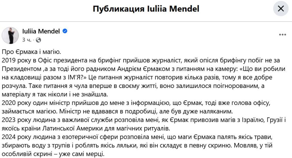 Далі колишня прессекретар президента згадує, що у 2023 році «людина з важливої служби» розповіла їй, як Єрмак привозив магів з Ізраїлю, Грузії і якоїсь країни Латинської Америки для магічних ритуалів.