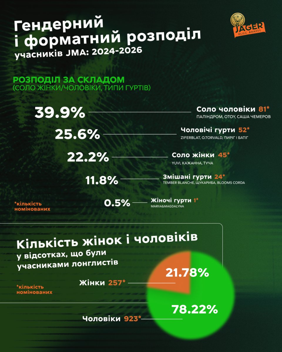 Аналіз лонглистів Jäger Music Awards вказує на зони росту в індустрії. Актуальними залишаються питання гендерного балансу та розширення розмаїття гуртів.