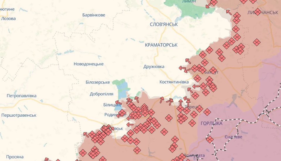 Стежити за змінами лінії фронту в Україні можна за допомогою онлайн-карти Deep State. На ній синім кольором позначена територія, звільнена за два останні тижні; зеленим — раніше звільнена територія; червоним — окупована територія; рожевим — територія, що потребує уточнення.