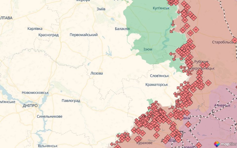 Стежити за змінами лінії фронту в Україні можна за допомогою онлайн-карти Deep State. На ній синім кольором позначена територія, звільнена за два останні тижні; зеленим — раніше звільнена територія; червоним — окупована територія; рожевим — територія, що потребує уточнення.