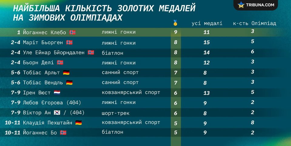 Норвезький лижник Йоханнес Клебо став найтитулованішим спортсменом в історії зимових Олімпійських ігор.