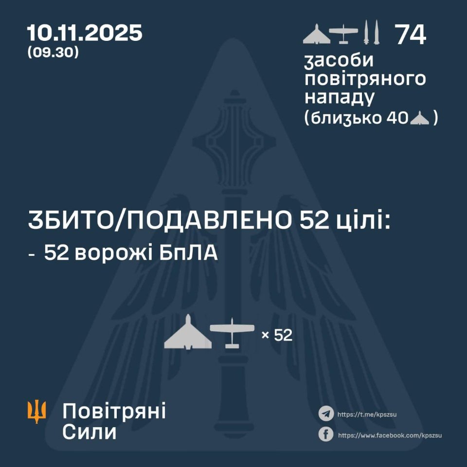 Станом на 9:30, за попередніми даними, відомо, що ППО збила або придушила 52 безпілотники різних типів на сході, півдні та в центрі країни. Решта 15 російських дронів влучили на дев’яти локаціях.