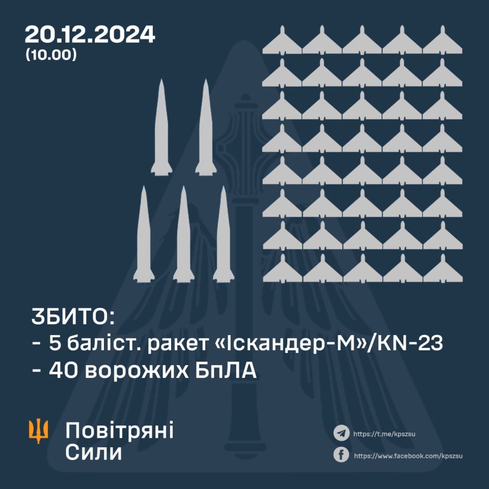 В ніч на 20 грудня українські оборонці збили п’ять ракет та 40 дронів, які війська рф запускали по Україні. Ще 20 дронів локаційно втрачені.