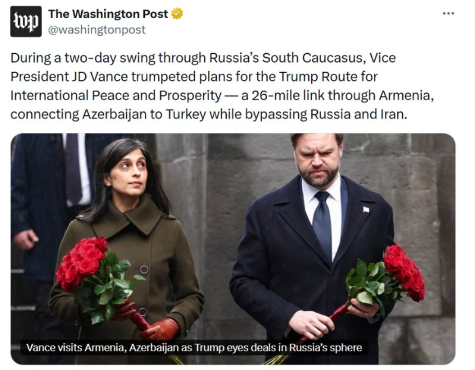 «Під час дводенного турне Південним Кавказом росії віцепрезидент Джей Ді Венс оголосив про плани щодо «Маршруту Трампа для міжнародного миру та процвітання» — 26-мильної сполучної лінії через Вірменію, яка з’єднає Азербайджан із Туреччиною, оминаючи росію та Іран», — написала WP.